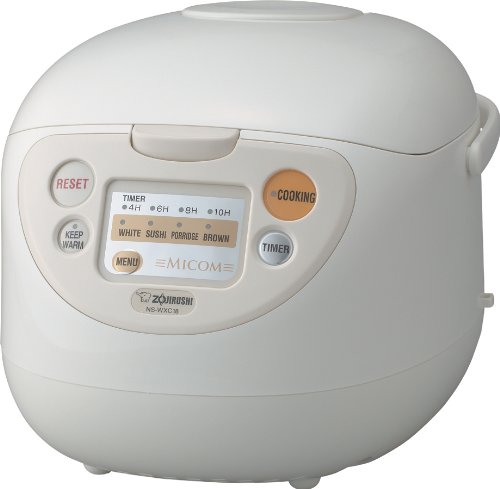 Zojirushi's NS-WXC18 was created using micro computerized Fuzzy logic technology. Equipped with a computer chip, the rice cooker can "think" and adjust cooking length and temperatures according to the thermal sensor's calculations. Micom rice cookers not only make perfect white rice, but also flawless brown rice, sushi rice, and porridge. Unlike the conventional rice cooker, soaking and steaming time before and after cooking rice is automatically programmed. This ricecooker has a dent resistant plastic body, automatic keep warm feature, delay timer, and 6 menu settings. 10 cup capacity.